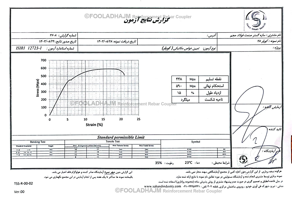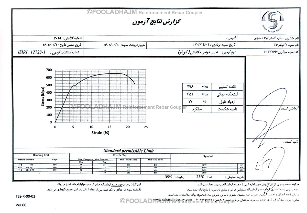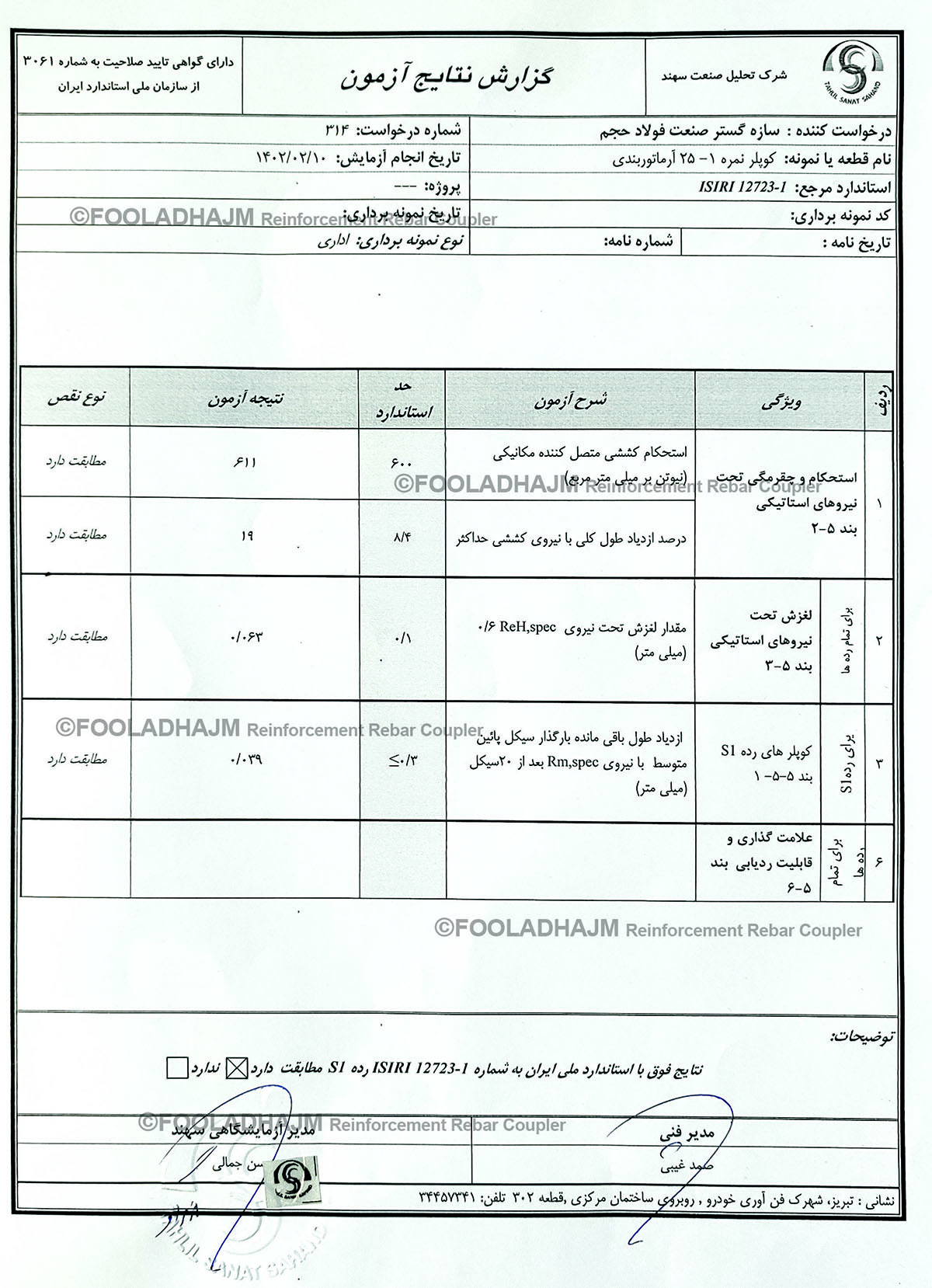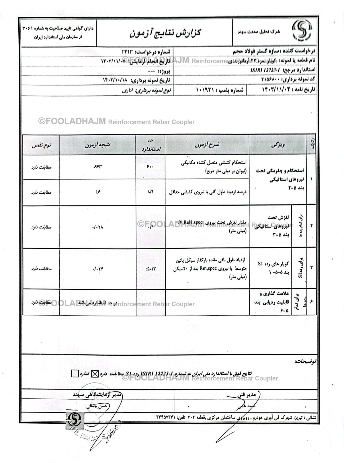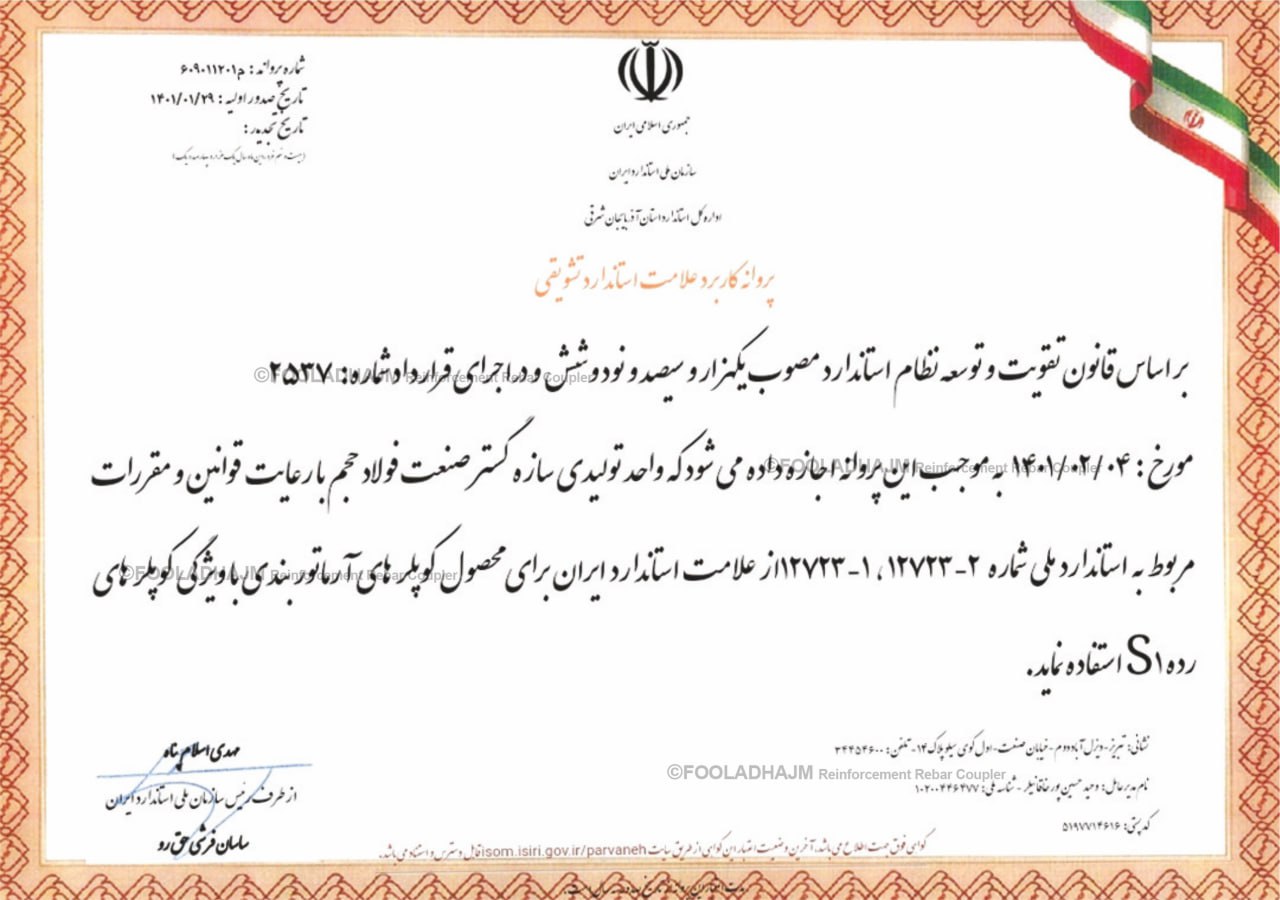محصولات تولیدی بر اساس پروانه شماره 609011201 دارای نشان استاندارد ملی ایران می باشند . کوپلینگ فولاد حجم بزرگترین تولیدکننده اتصالات مکانیکی میلگرد در شمالغرب کشور بوده و تولیدات شرکت در بسیاری از پروژههای عمرانی سطح کشور استفاده شده است .